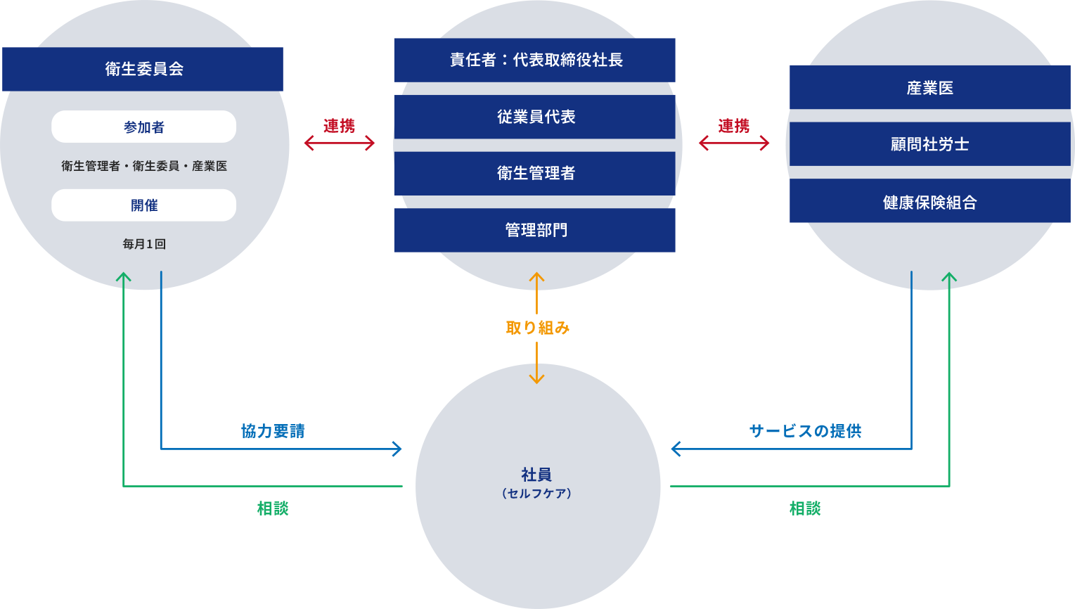 産業医、顧問社労士、健康保険組合と連携を取りながら推進してまいります。